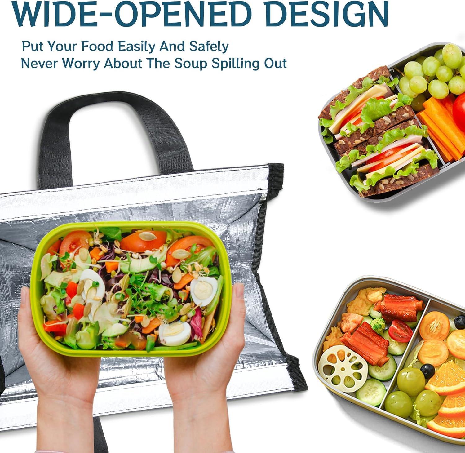Wide-Open & Velcro Closure: The entrance of the thermal lunch box can be opened up to 9.5″L x 6.7″W big. Therefore your containers can be put into the bag easily